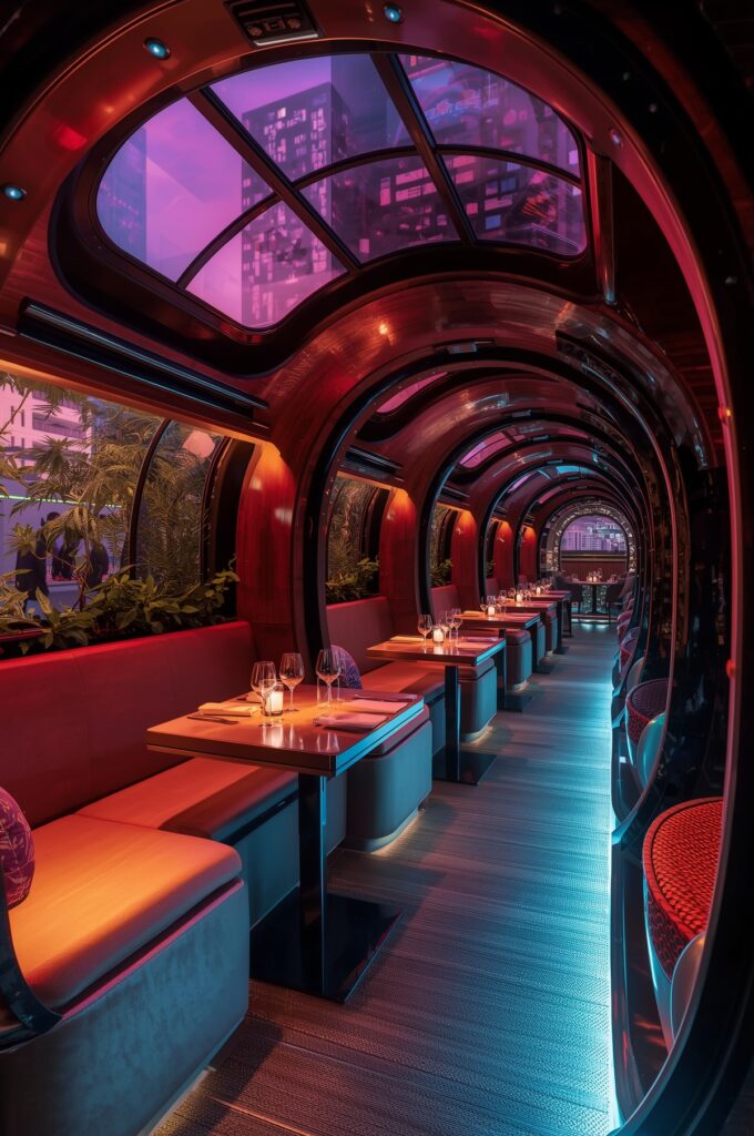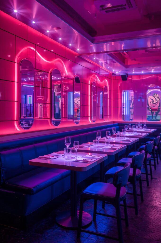 Restaurants are experimenting with glowing neon accents, futuristic lighting, and bold color palettes to create a high-energy, Instagram-worthy environment.