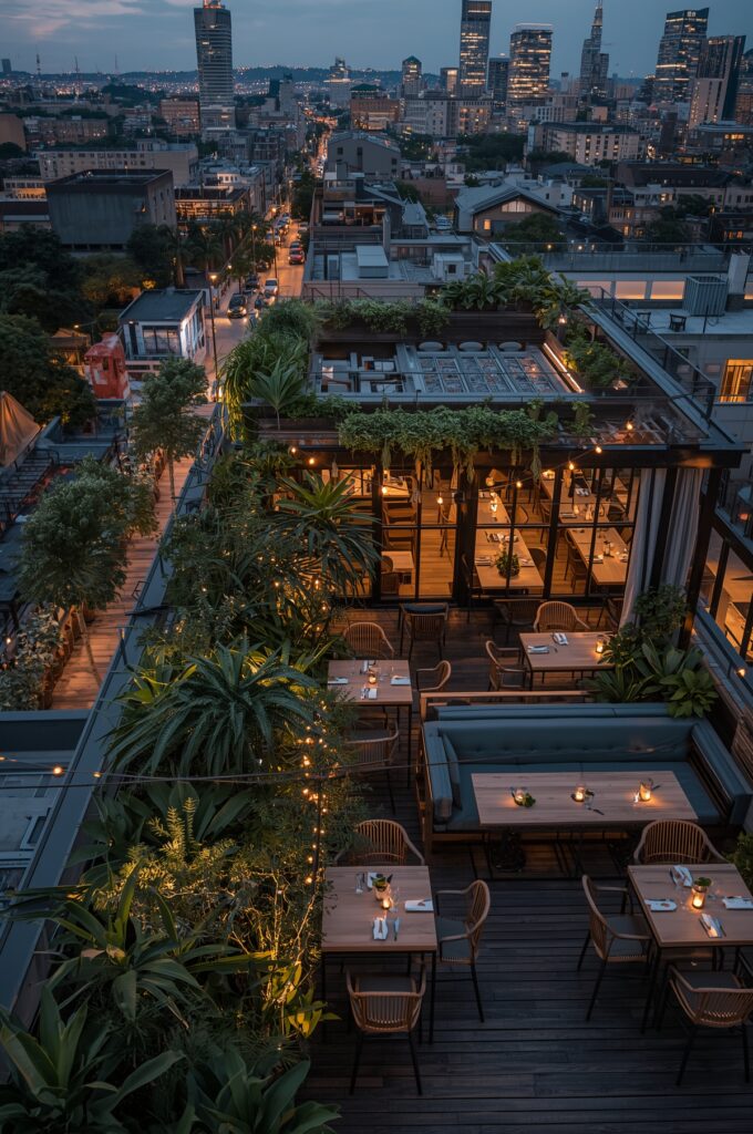 Rooftop restaurants with open-air layouts, string lights, and greenery are in demand for city dwellers seeking escape from urban hustle.