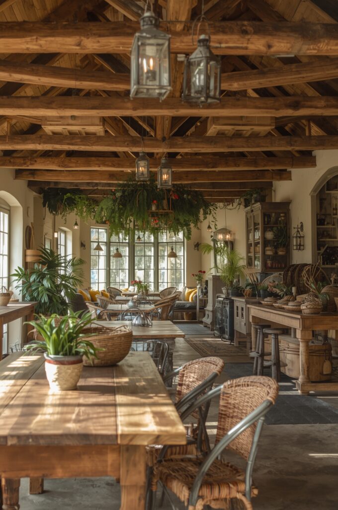 Wooden beams, vintage lanterns, and cozy communal tables create a farm-to-table atmosphere that emphasizes authenticity and comfort.