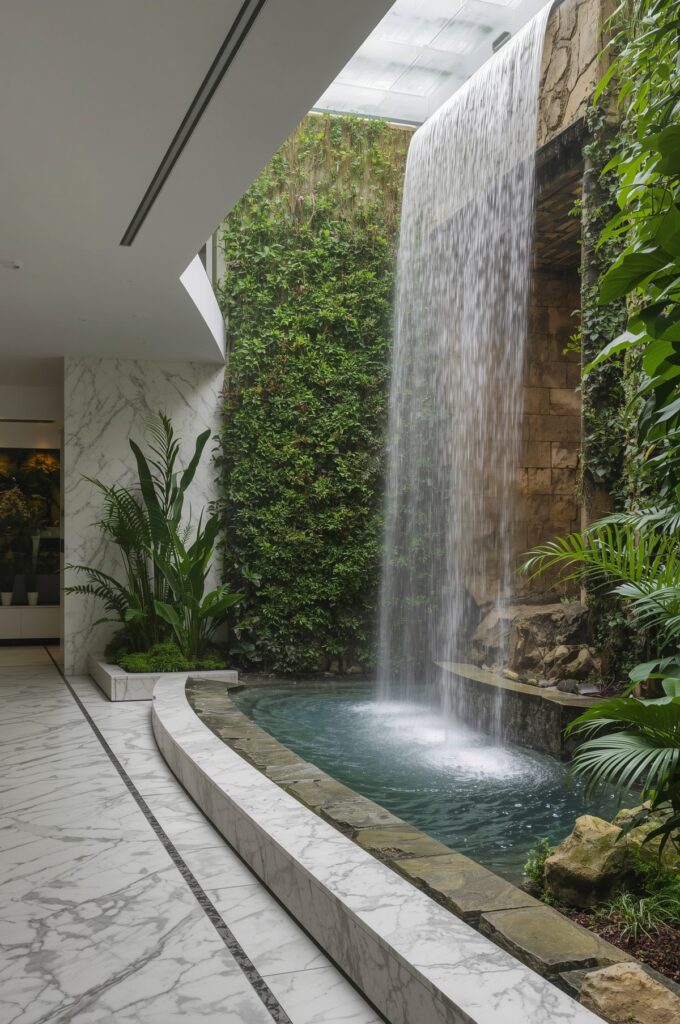 Biophilic design combines nature with upscale luxury—marble floors meet indoor waterfalls, green walls, and organic materials, balancing sophistication with freshness.