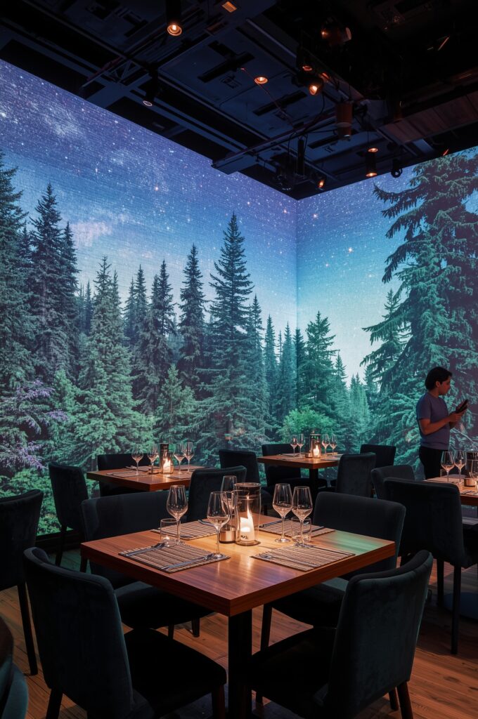 LED walls and projection mapping bring dining to life with animated backdrops—think starry skies, forests, or urban landscapes that change with the mood.