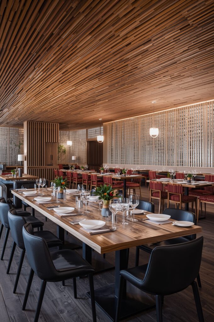 Restaurants are embracing eco-friendly design with reclaimed wood furniture, energy-efficient lighting, and lush greenery. This “green” approach appeals to environmentally conscious diners.
