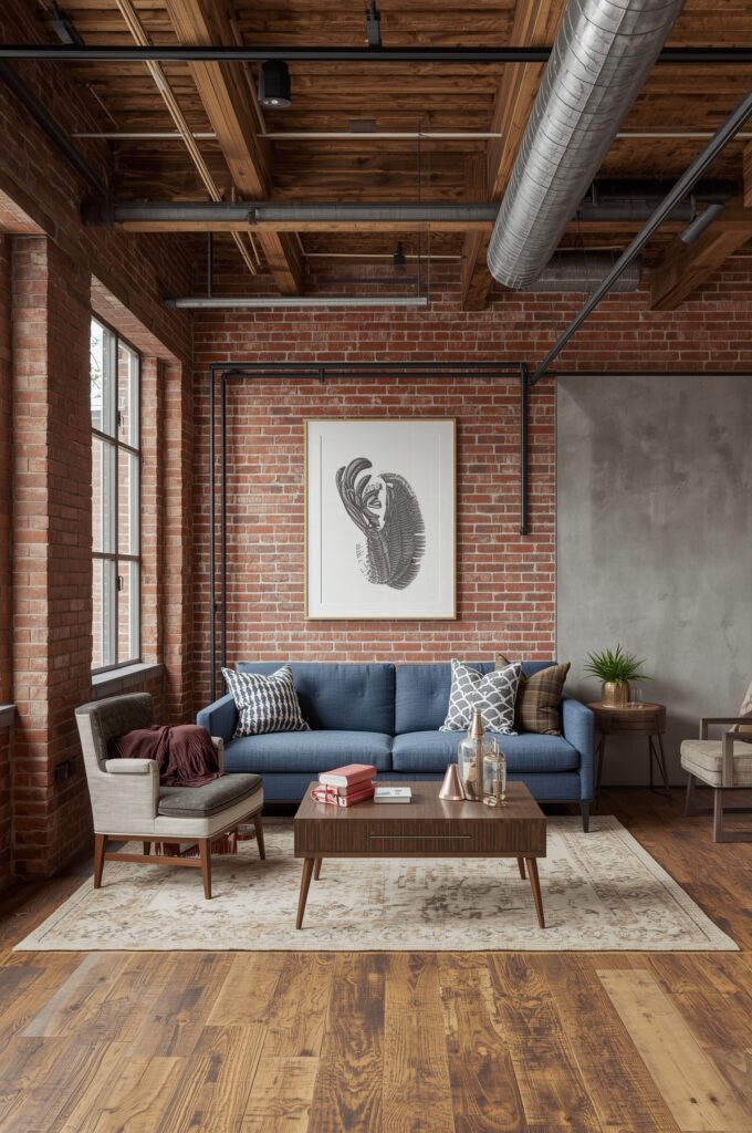 Exposed brick, metal pipes, and rustic wood blend with chic furniture to create a modern yet nostalgic vibe. Industrial design remains a strong favorite in 2025.