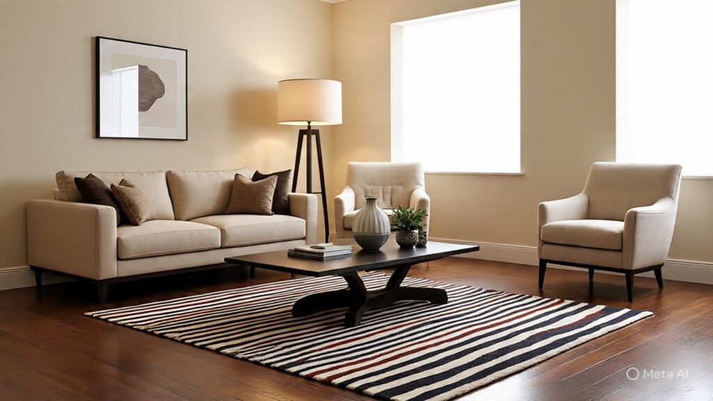 Striped rugs elongate the living room, creating the illusion of space. Choose bold stripes for a playful look or muted ones for subtle elegance.
