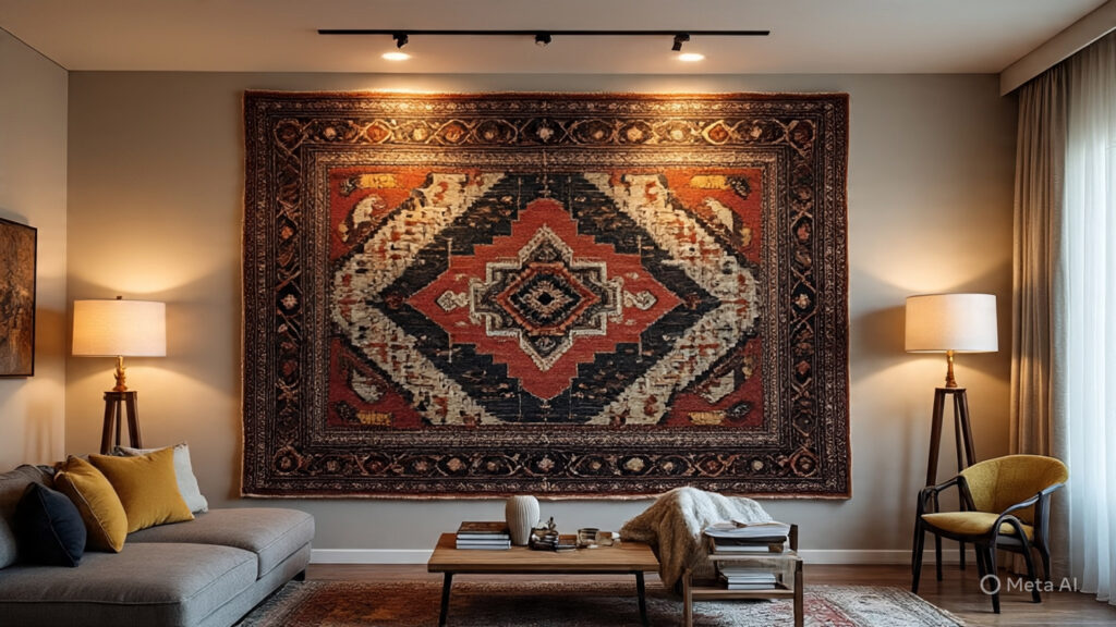Think outside the box—rugs don’t always have to stay on the floor. Hanging a rug as wall décor creates a unique statement feature in your living room.