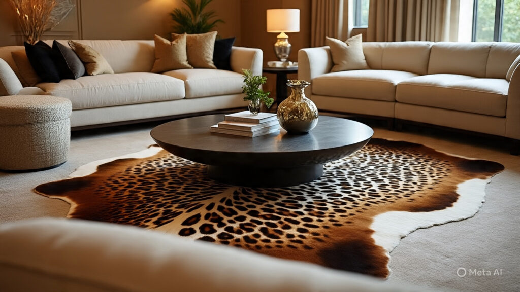 Leopard, zebra, or cowhide-inspired rugs instantly add a glamorous edge. They pair particularly well with bold accent pieces and metallic décor.