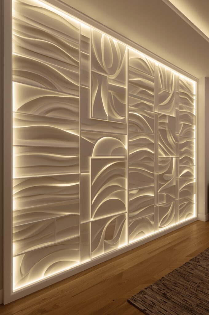 LED backlighting behind panels creates a luxurious ambiance. This futuristic style is ideal for feature walls in living rooms, hallways, or bedrooms.
