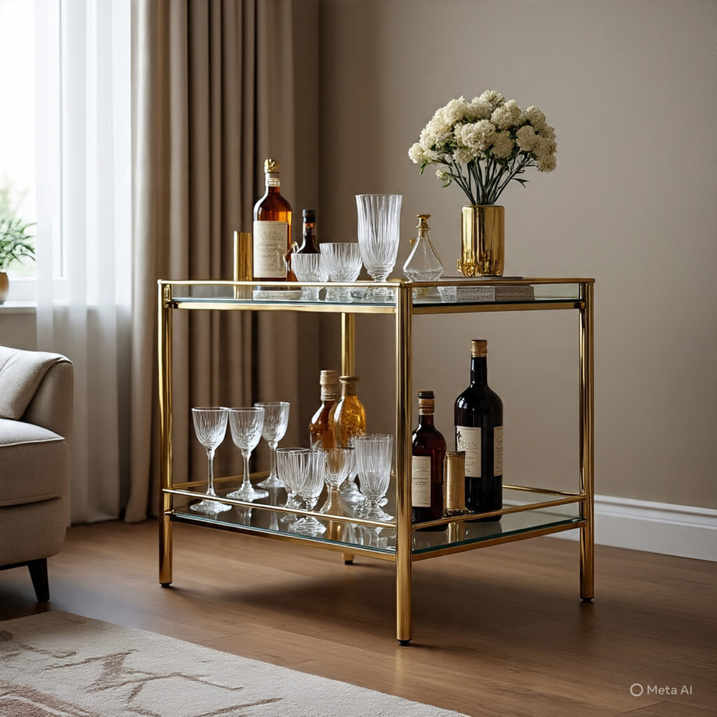 A mobile serving station, often with metallic gold finishes and glass shelving.
