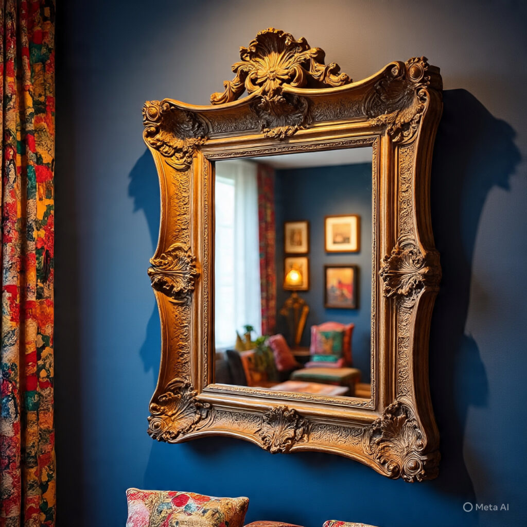 A large, uniquely framed mirror that serves as both décor and a functional piece.