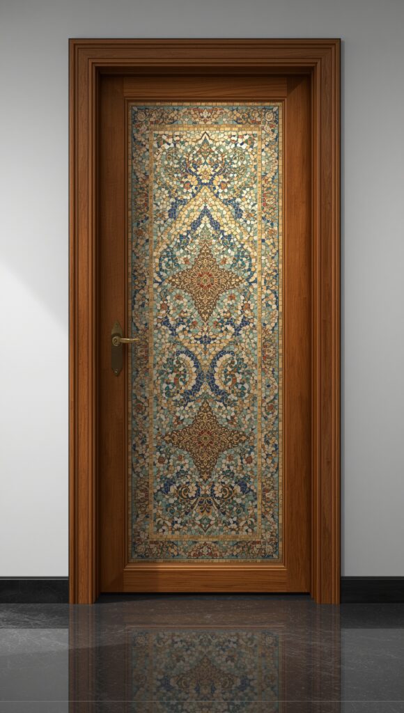 Drawing inspiration from Moroccan, Turkish, and Mediterranean styles, these doors are decorated with intricate tilework or colored glass pieces arranged in symmetrical patterns.
