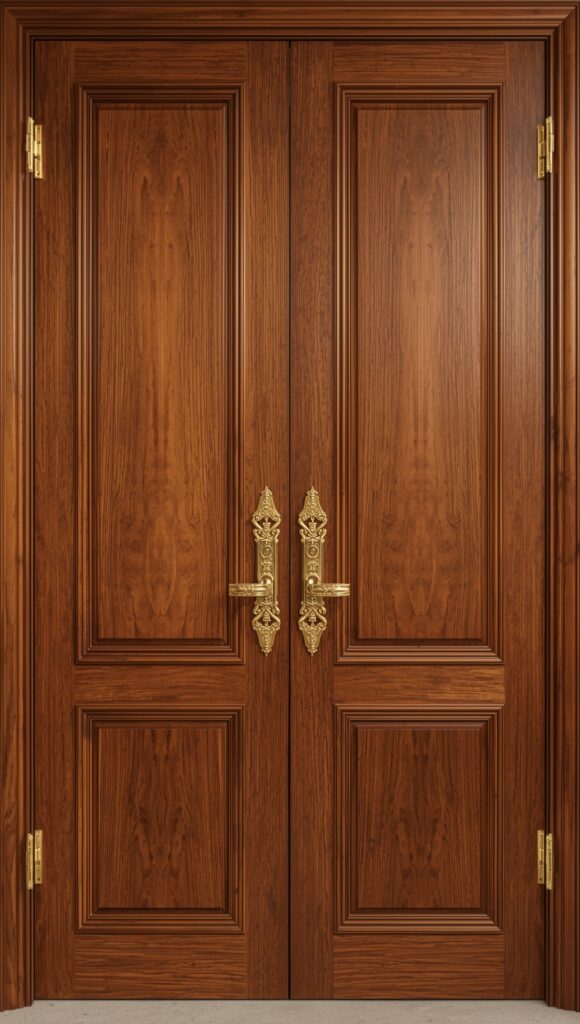 Teak wood is known for its durability and classic beauty. Oversized teak doors paired with polished gold handles or accents add a touch of old-world charm and grandeur to any home entrance.