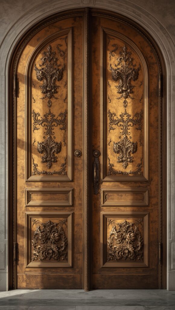 Designed by architects or artists, these doors are one-of-a-kind pieces — sculpted in wood, bronze, or resin to look like waves, trees, abstract forms, or even 3D illusions.