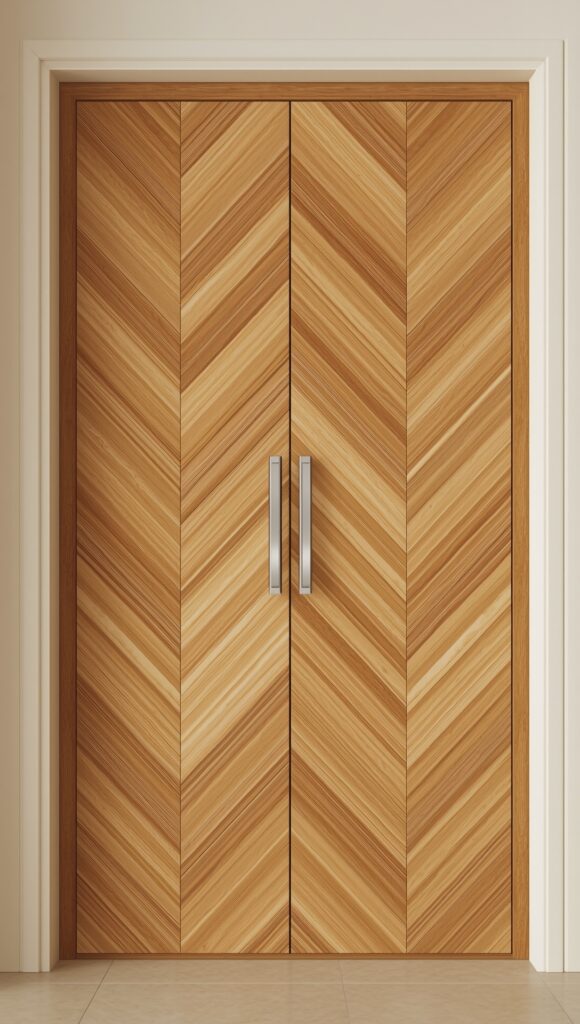 These doors feature geometric wood patterns, often in a chevron or herringbone style. Veneered finishes in walnut, oak, or rosewood add depth and texture.