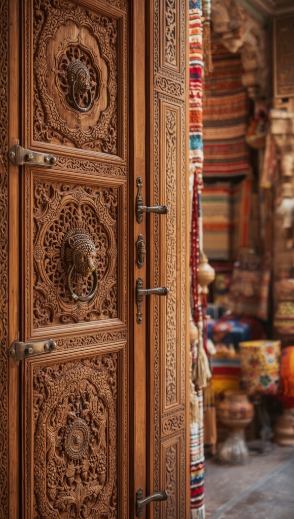 A nod to royalty and tradition, these hand-carved doors are rich in detail, often featuring floral, religious, or mythological motifs. Originating from the palaces of Rajasthan, these designs are a work of art in themselves.